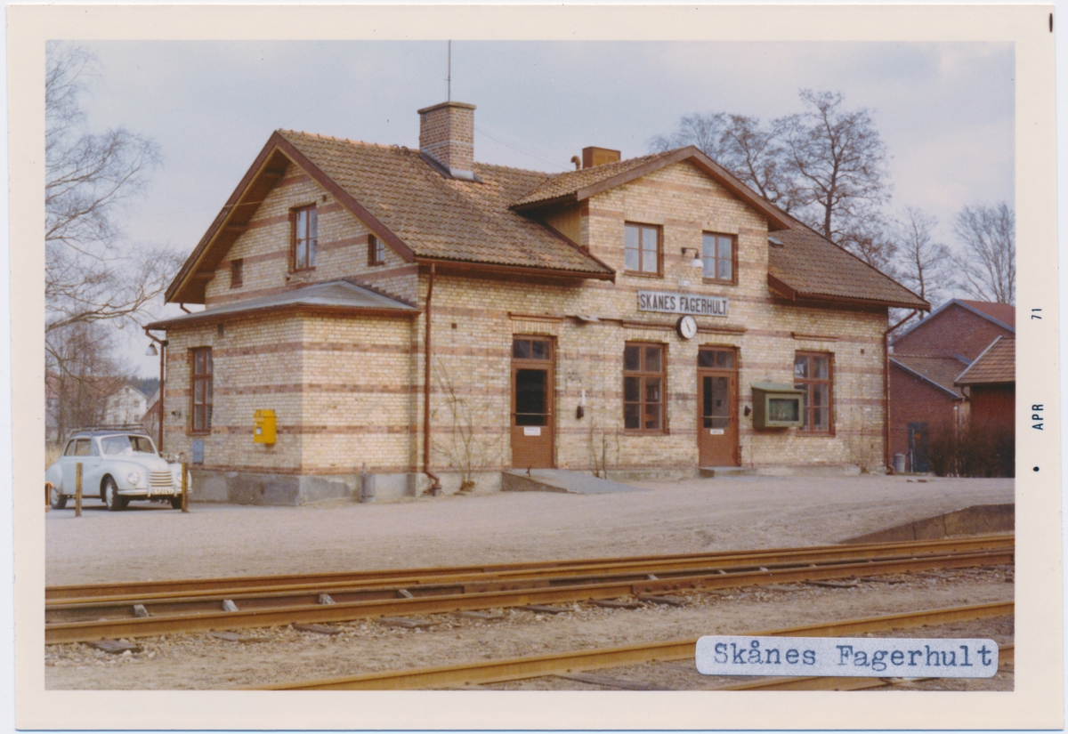 Titel: Stationen byggd 1893 av SSJ. Tillbyggd flygel 1946, Hette före 27 juni 1923 ÅSBO-FAGERHULT. En- och enhalvvånings station i tegel. 1941 renoverades bygnaden fullständigt och fick helt ny inredning. Till SJ 1940. Persontrafiken nedlagd 1968. Spåren revs mellan 1999- 2010 i olika etapper.