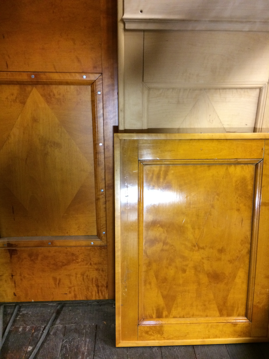 Fyllning, snickerimönster, i dörrar och väggpanel, samt en referens från annan vagn.
