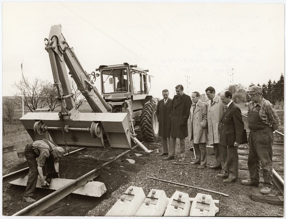 Grimman lossas från betongslipern av Henning Eriksson och traktorförare Bo Johansson är redo att placera ut nästa sliper. Bengt Peel, Ingvar Svensson, Georg Storm, Gösta Johansson, Evert Gustavsson och Lars Olsson övervakar.