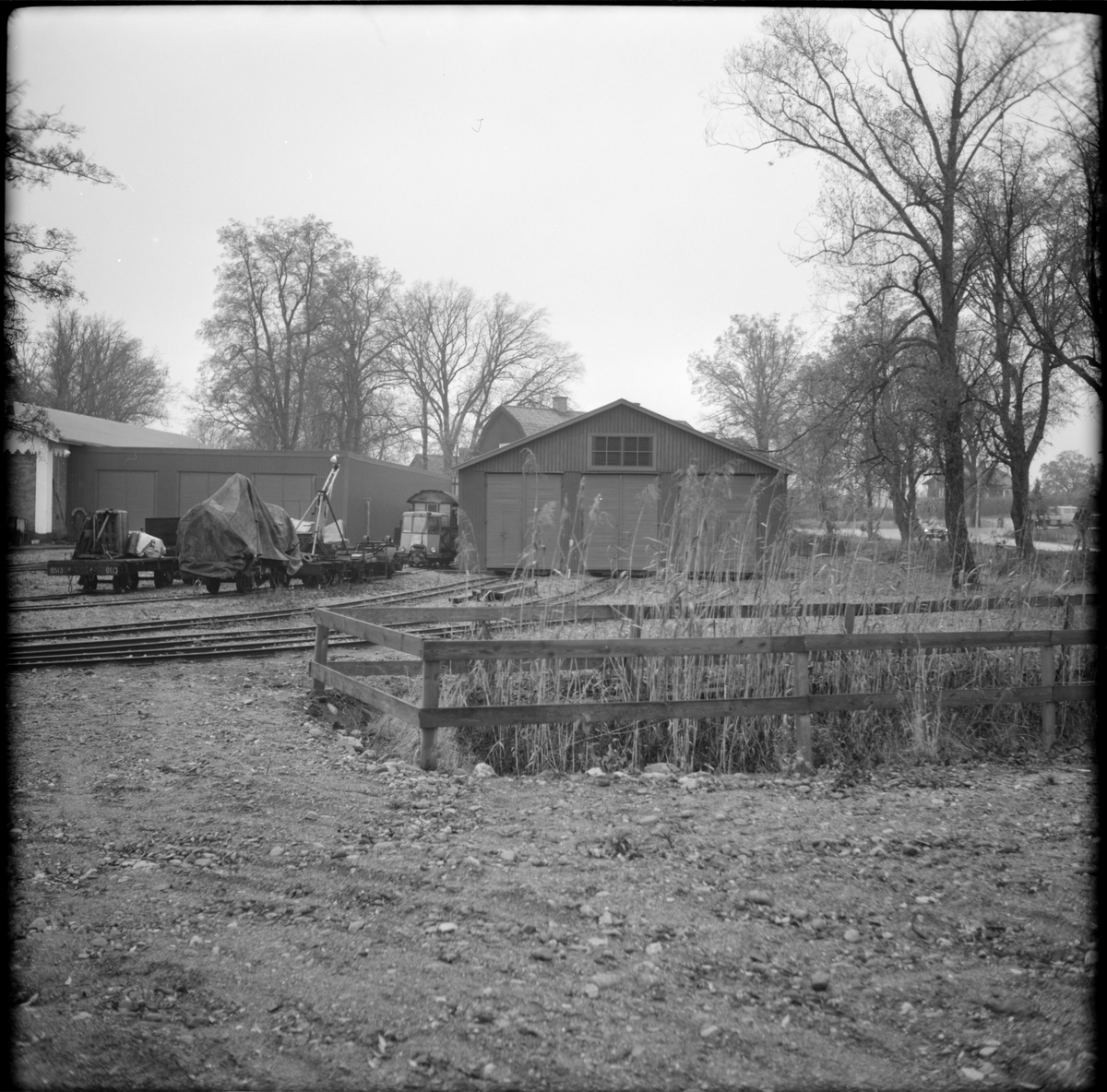 Vy över del av bangården med verkstad mitt i bild som användes av Museijärnväg Östra Södermanlands Järnväg, ÖSlJ.