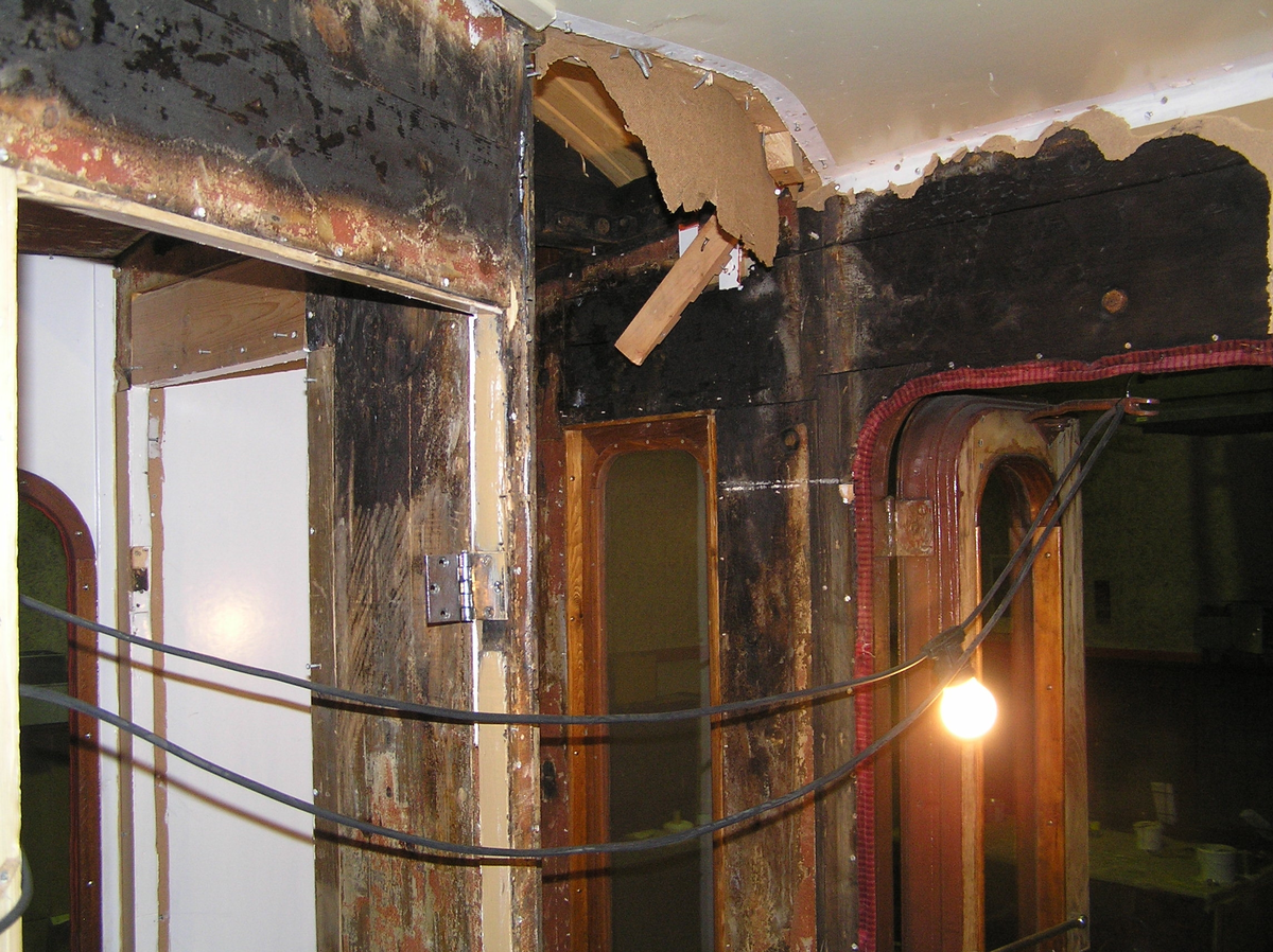 Del av brandhärjad vägg och tak i vestibul i SJ Ro2 2702 innan demontering. Inrymde tidigare toalett men är nu teknikrum.