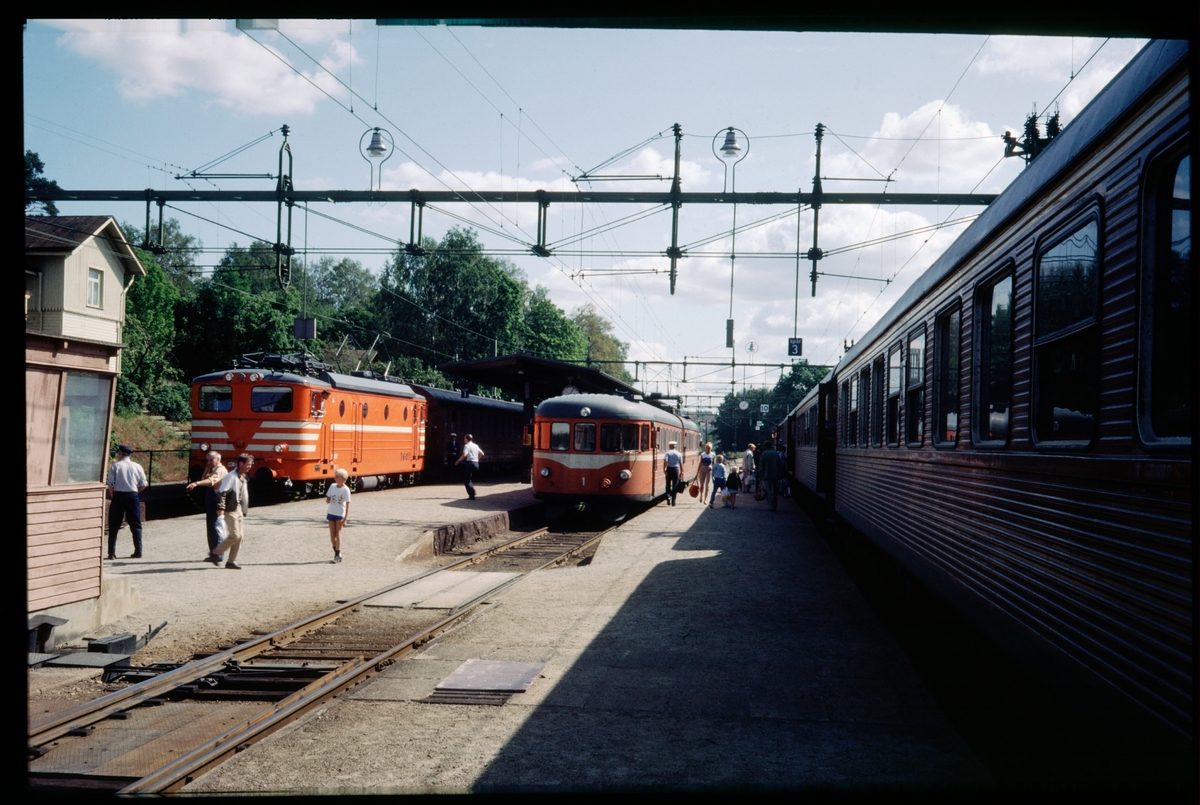 Trafikaktiebolaget GrängesbergOxelösunds Järnvägar, TGOJ Bt 307, TGOJ X21-1 samt persontåg på bangården vid Åkers Styckebruk.