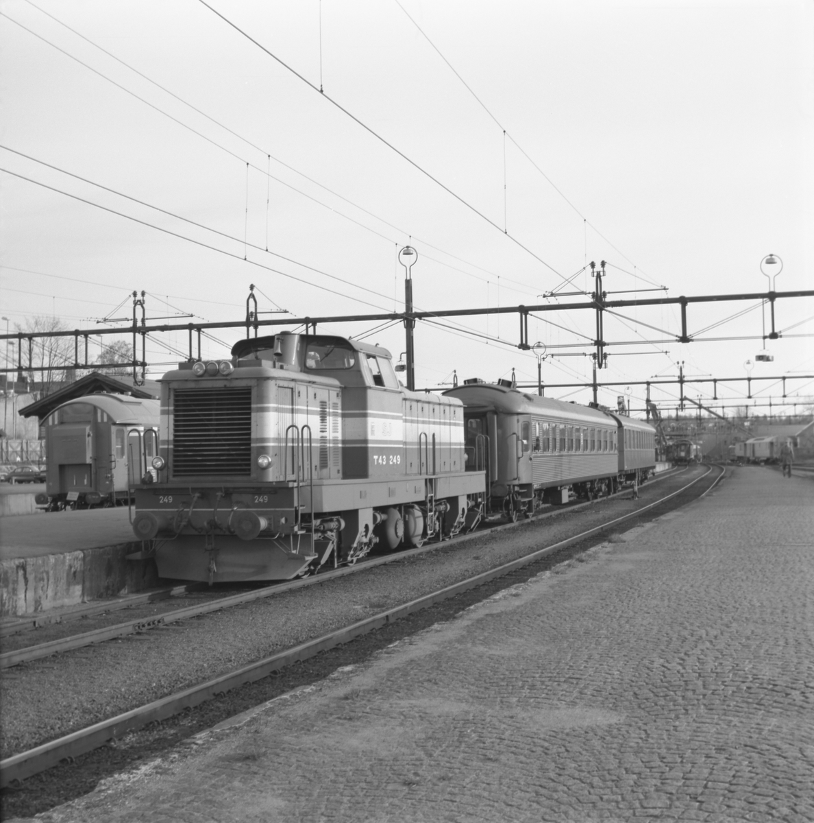 Olycka i Nässjö 1979. Statens Järnvägar, SJ T43 249 växlar personvagnar. Kranar i bakgrunden.