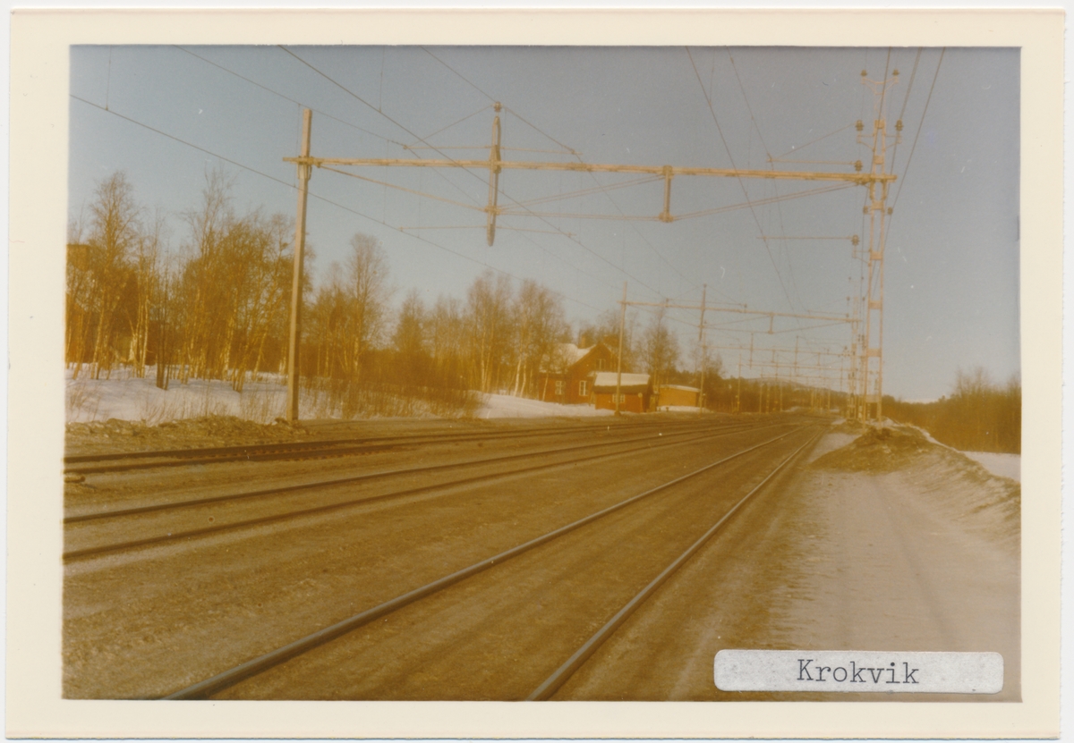 Vy vid Krokvik.Trafikplats anlagd 1903 Stationshuset byggdes 1908-01-01 och ritades av Folke Zettervall. Stationshuset är ett en vånings hus i trä, tillbyggt 1914. Elektrifierat 1915.