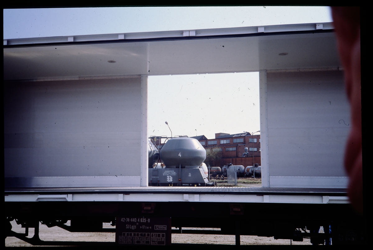 Statens Järnvägar, SJ jumbocontainer 1361 001 lastad på SJ Lgjs 42-74-440 4 635-8. Statens Järnvägar.