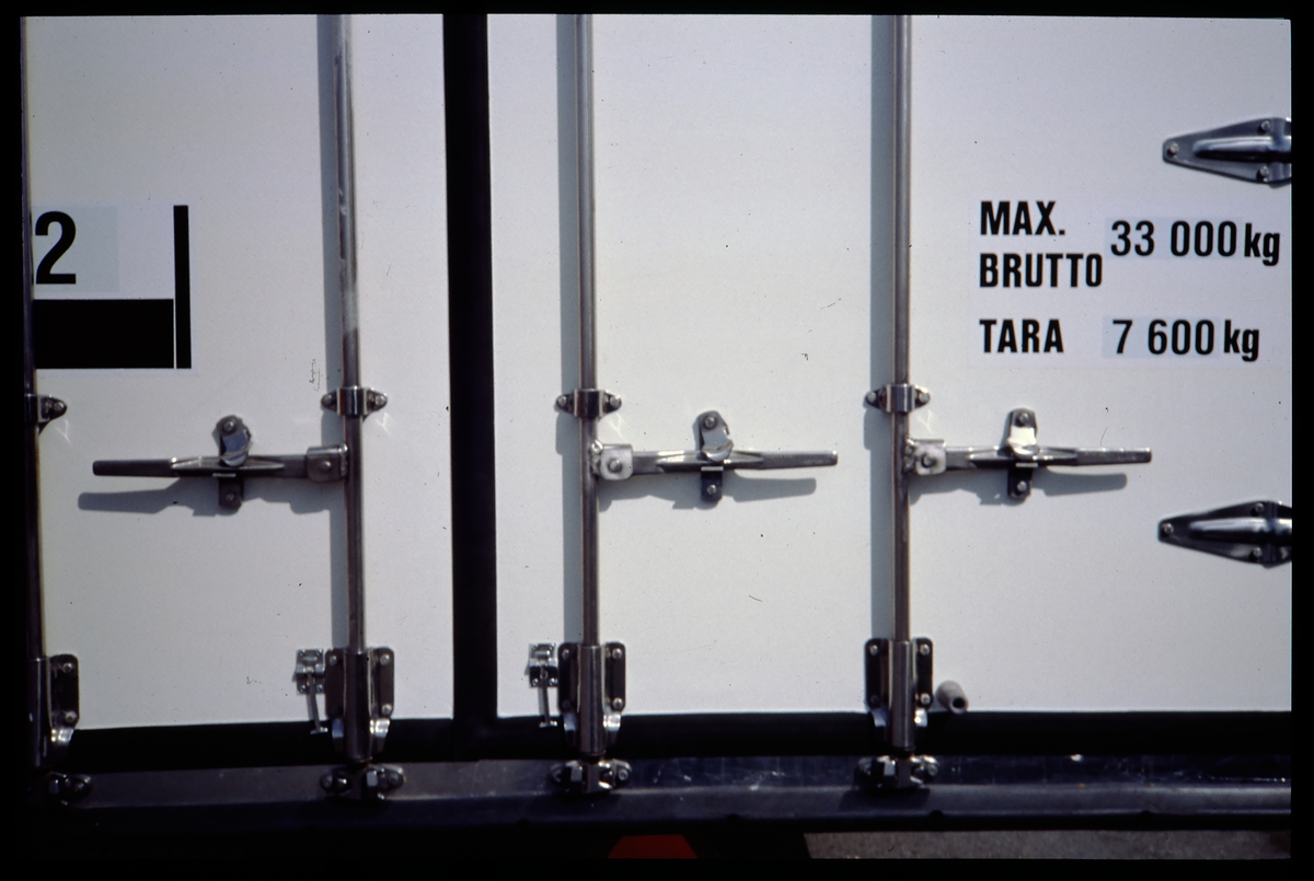 Dörrar och viktinformation på en containers.