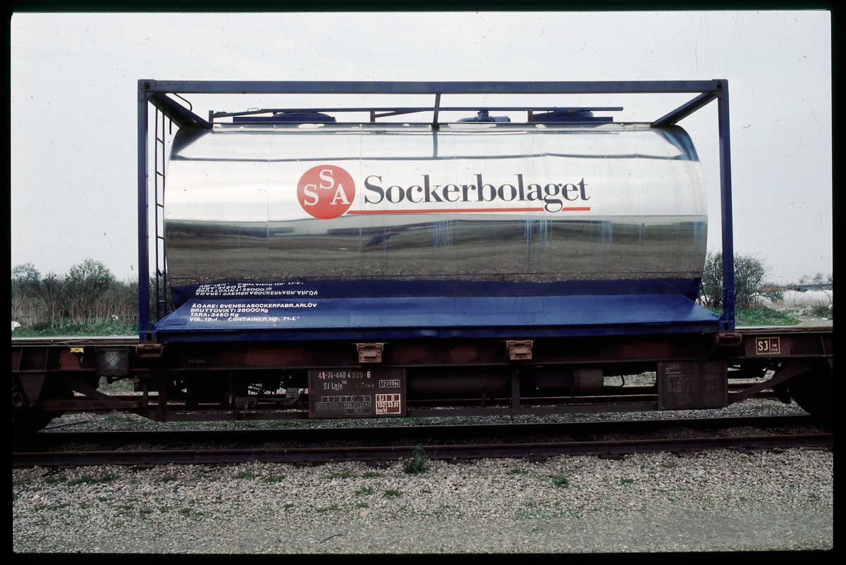 Behållare från Svenska Sockerfabrik AB, SSA, lastad på Statens Järnvägar, SJ Lgjs 41-74-440 4 509-6.