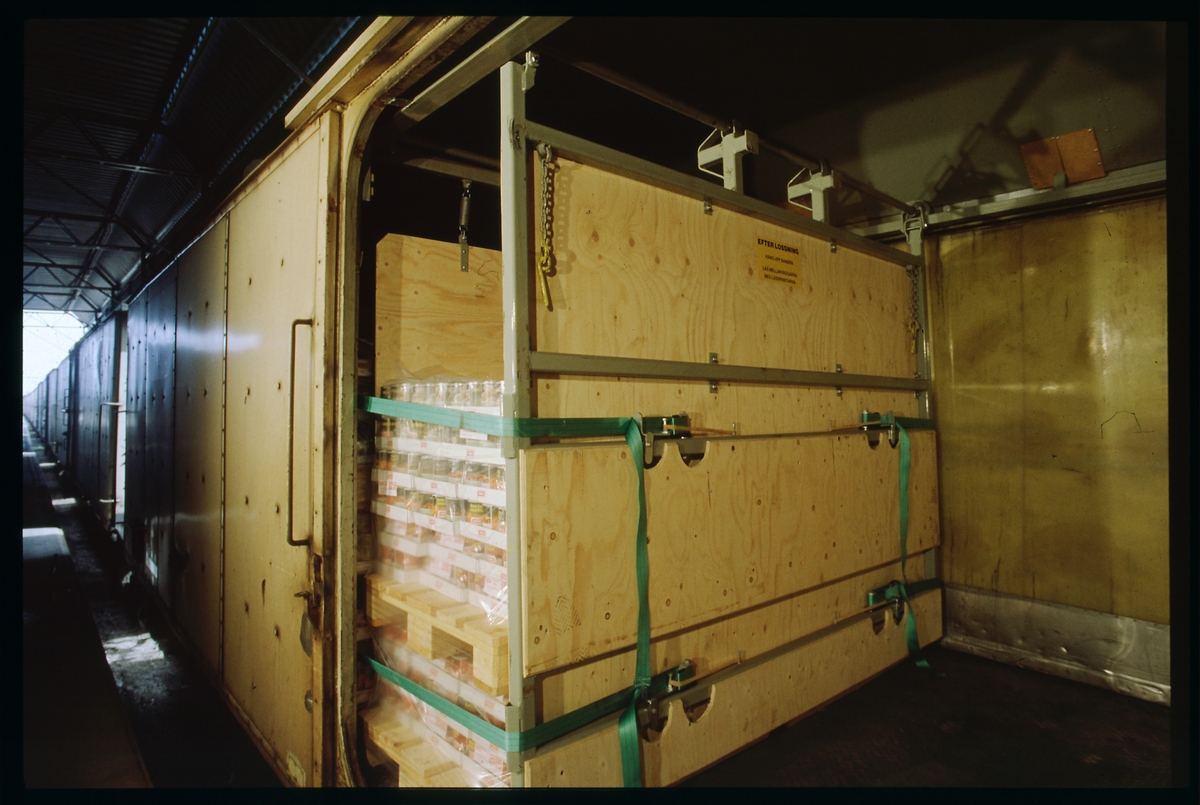 Lastavskiljande mellanvägg i godsvagn med skjutbara dörrar.
