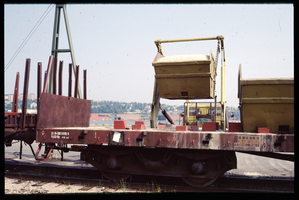 Lossning av gruscontainer från SJ Rs 31-74-390 0 019-9. Statens Järnvägar.
