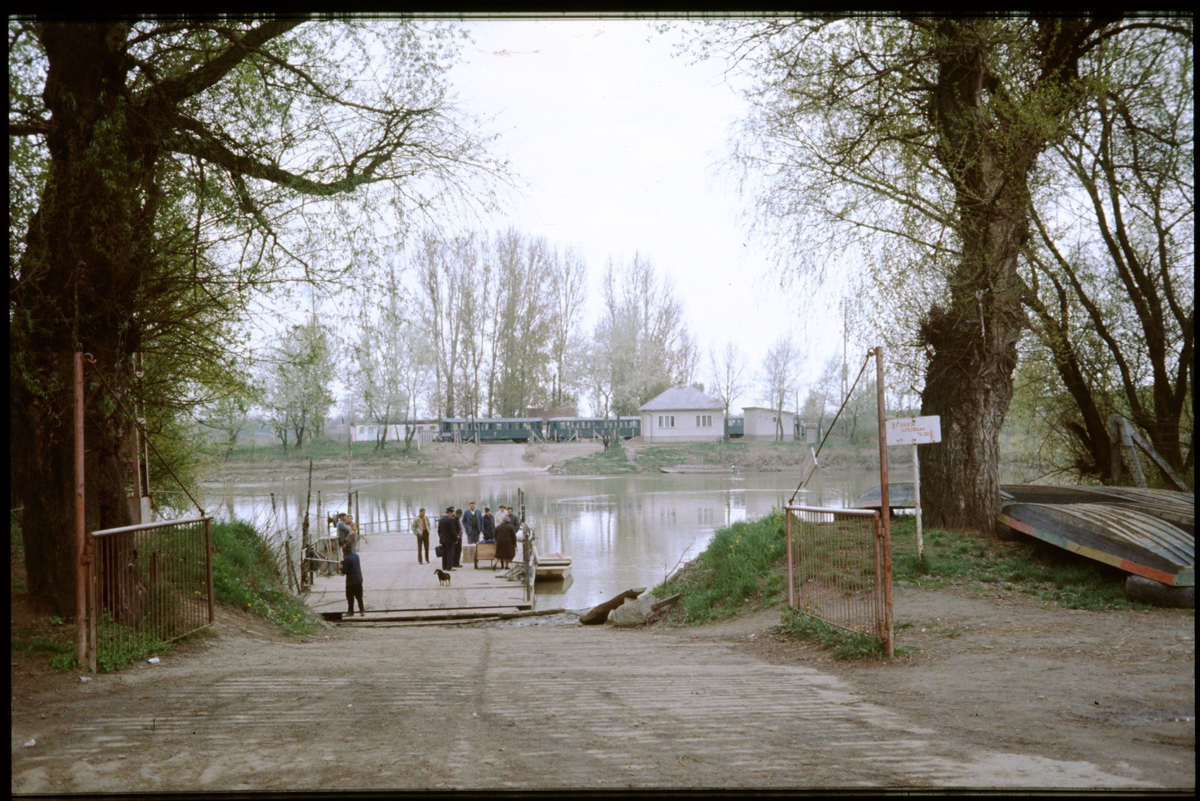 Färja över floden Tisza till Kenezloi stationen, Ungern.