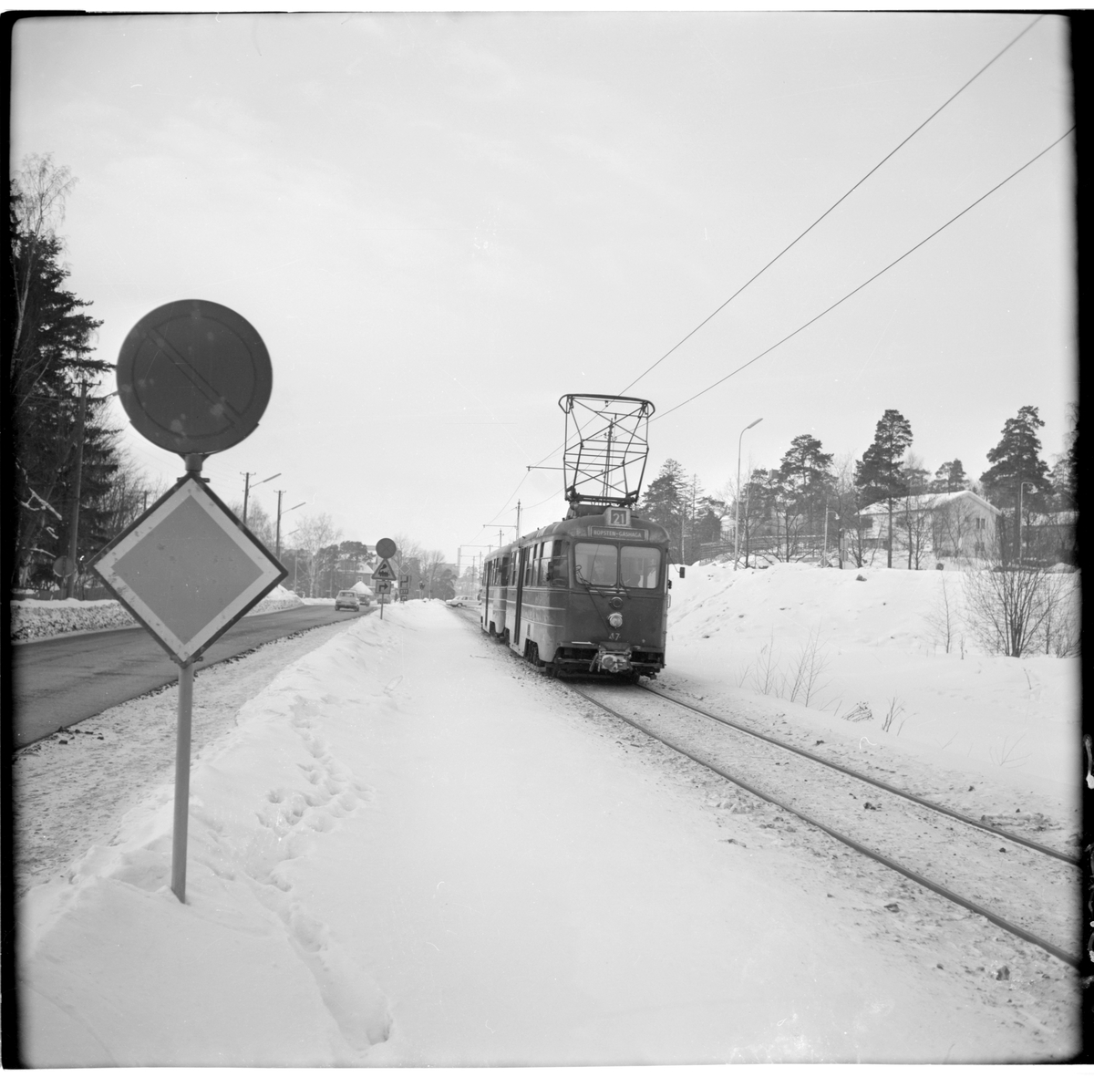 Trafik Aktiebolaget Stockholm Södra Lidingöns Järnväg, SSLidJ A24(A) 47 "ängbyvagn" linje 21 Ropsten - Gåshaga på linjen mellan Centralvägen och Parkvägen sedd västerut.