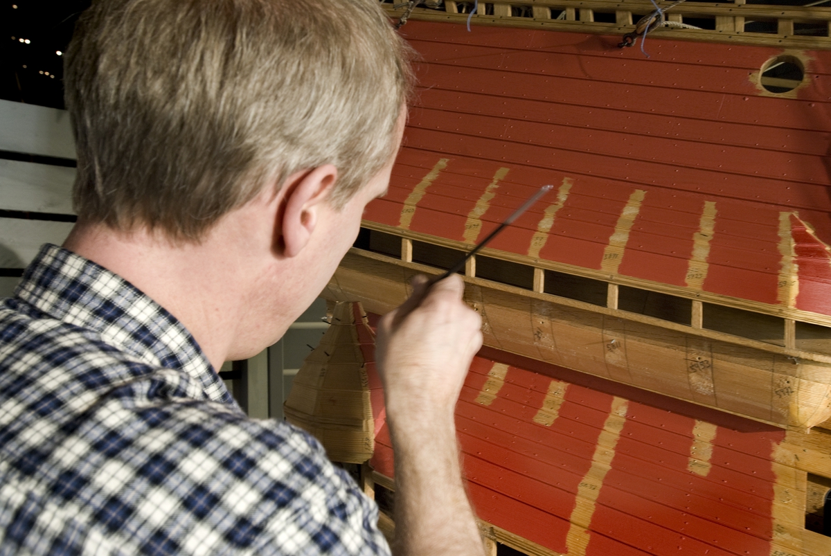 Vasa-modellen i skala 1:10 målas. Modellbyggare Stefan Bruhn i arbete.