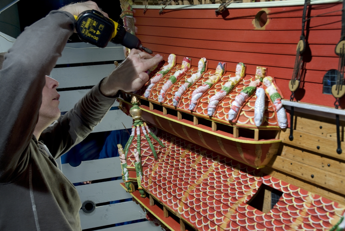 Modellbyggare Stefan Bruhn arbetar på Vasa-modellen.