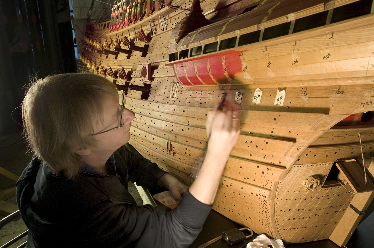 Vasa-modellen i skala 1:10 målas. Modellbyggare Jan Claesson i arbete.
