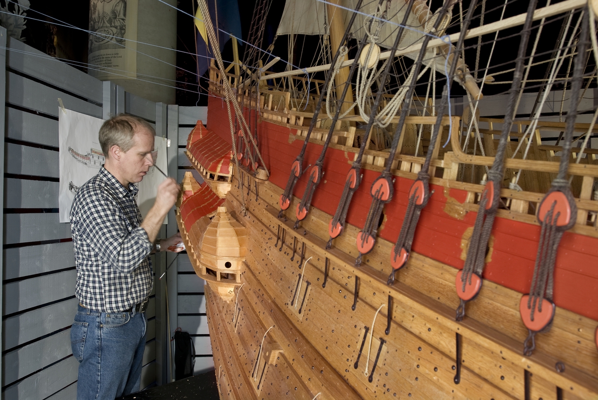 Titel: Vasa-modellen i skala 1:10 målas. Modellbyggare Stefan Bruhn i arbete.