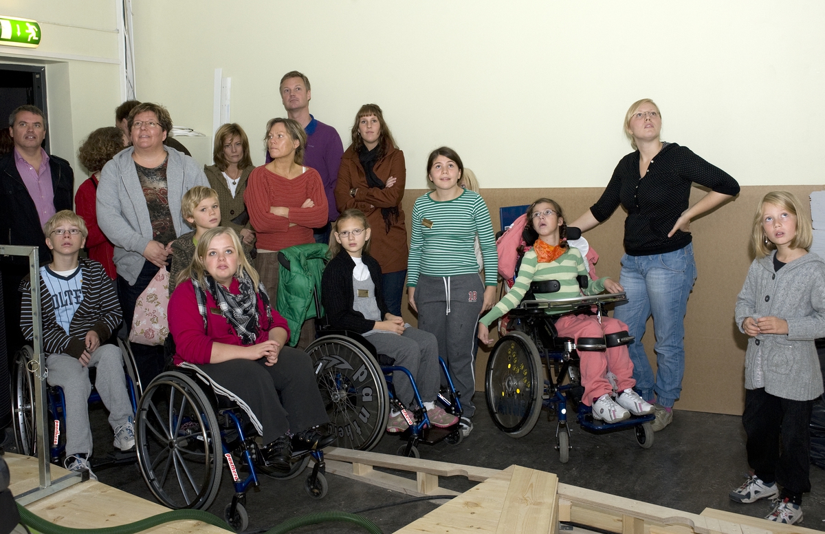 Referensgruppen i projektet Alla Ombord testar utrustning 27 sept 2008. Fr vä Fredrik Johnsson, Therese Sundqvist, Julia Hedenström, Laura Stridh Guerra, Julia Snees och Matilda Kritz (Filippas syster) samt föräldrar och assistenter