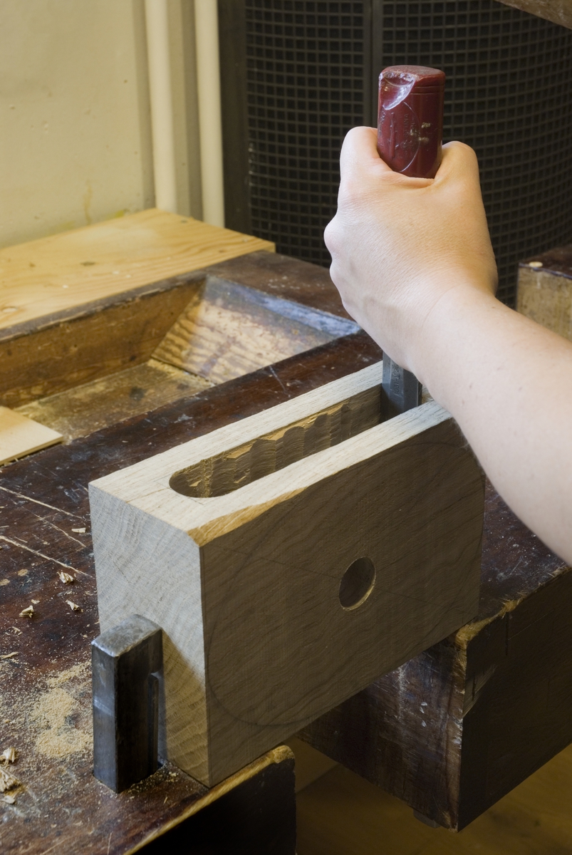 Maria Eriksson tillverkar ett block i snickeriet på Vasa till Vasaboken vol. 2