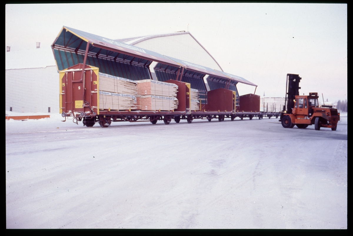 Statens Järnvägar, SJ Hbins-u. typ 853. Godsvagn med öppningsbar sida märkta SCA Shipping AB. Lastning/lossning av virkesbuntar med truck.