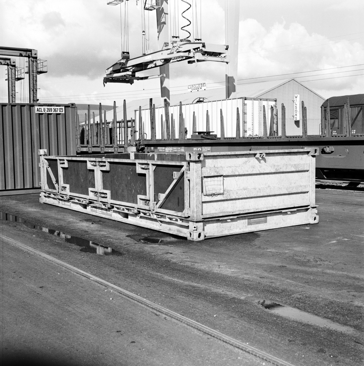 Containerflak. I bakgrunden syns godsvagnar och en containertravers.