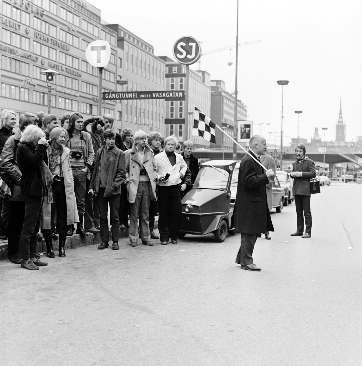 "En timme i tiden". BFF-jippo i samband med 75-årsjubileet i Stockholm."Fotot taget vid taxiplan mellan Stockholm Central och Vasagatan. Riddarholmskyrkans torn längst bort i bild.