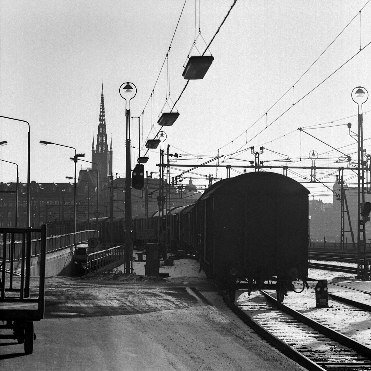 Första dagen, tågledarstrejken. Godståg på väg söderut över norra Järnvägsbron, på sträckan mellan Stockholm Central och Riddarholmen. Riddarholmskyrkans torn i bild.