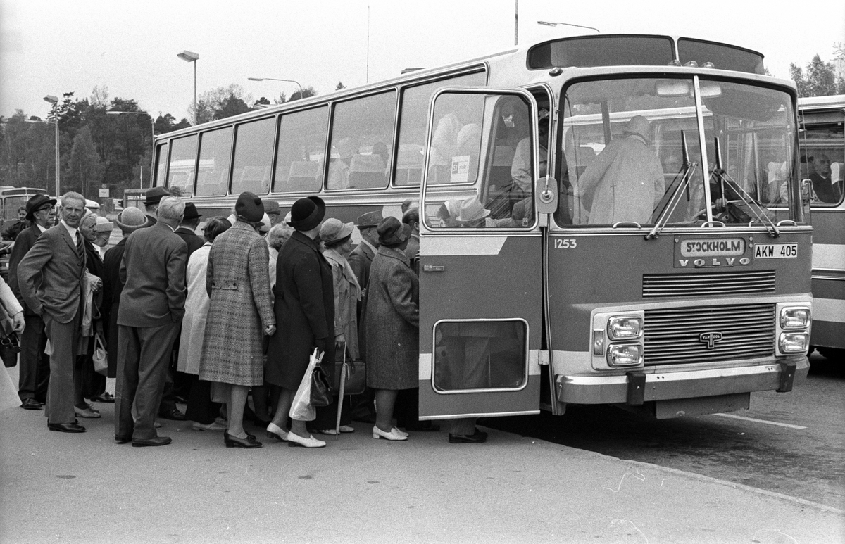 Busshållplats resande med utflyktståg från Värmland. Statens Järnvägar, SJ buss 1253.
