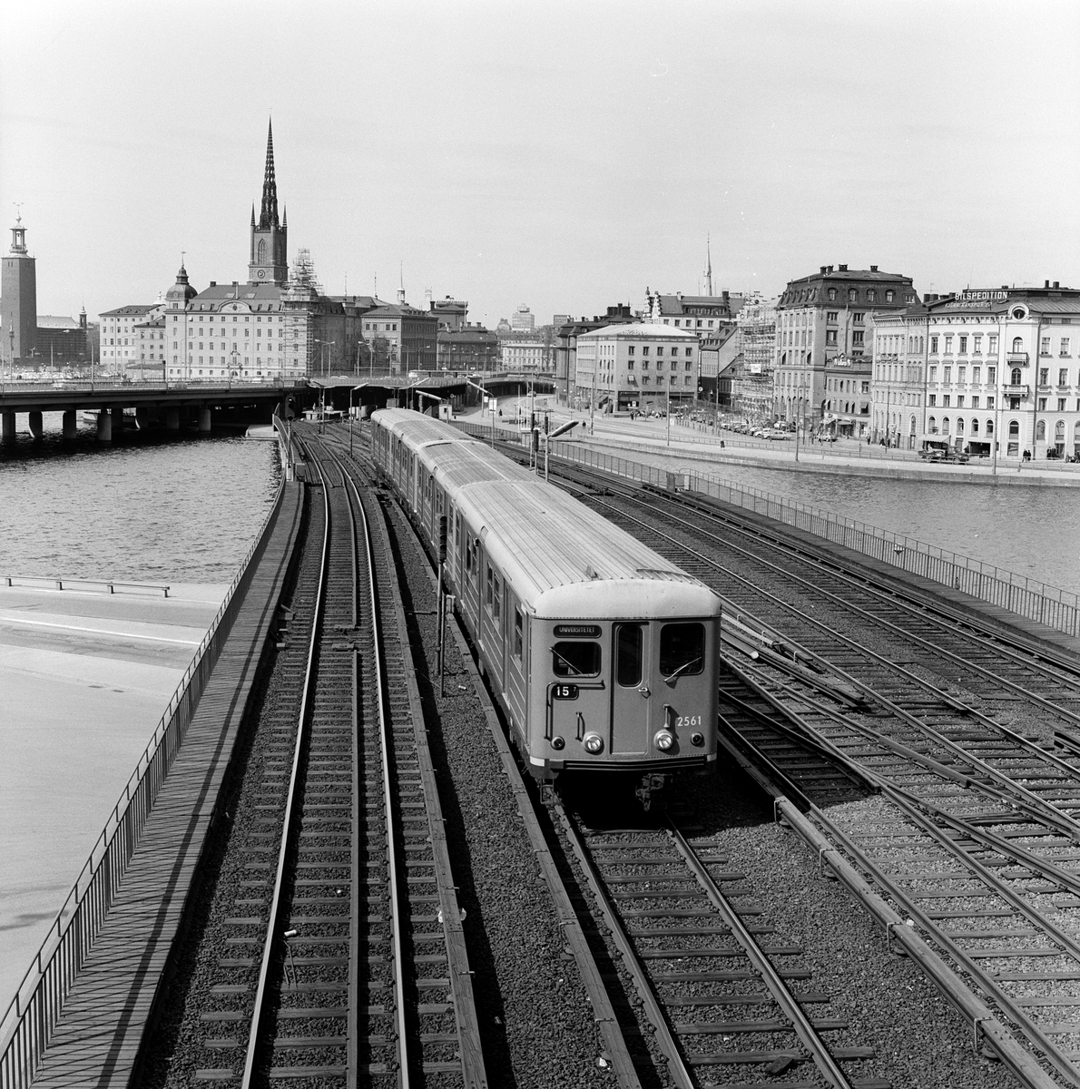 Stockholms Lokaltrafik SL 2561.Tunnelbanetåg Stockholms T-bana. På sträckan mellan Gamla Stans tunnelbanestation (Riddarholmen) och Slussens tunnelbanestation (Stadsgården).