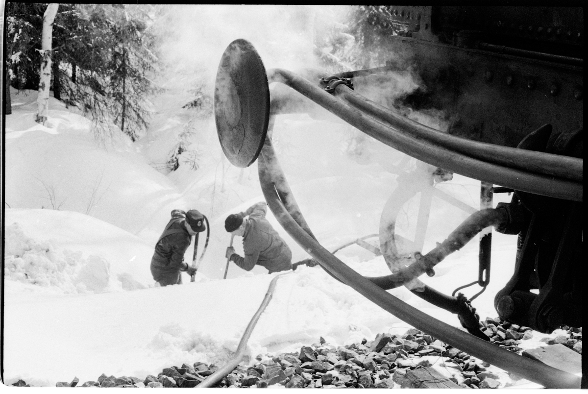 Igenfrusna trummor upptinas med ånga från ånglok.