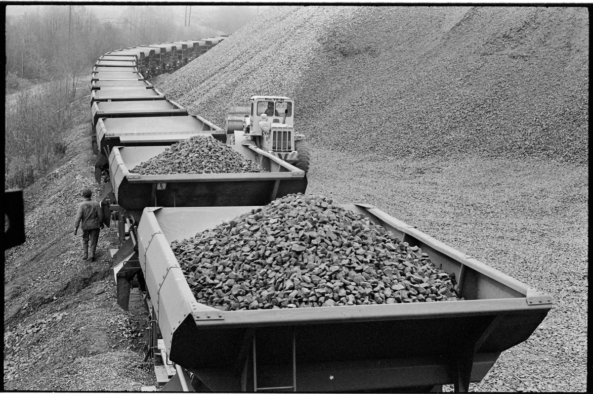 Bottentömningsvagnar, Statens Järnvägar, SJ Q 32. Lastning av makadam i Hjältakrossen.