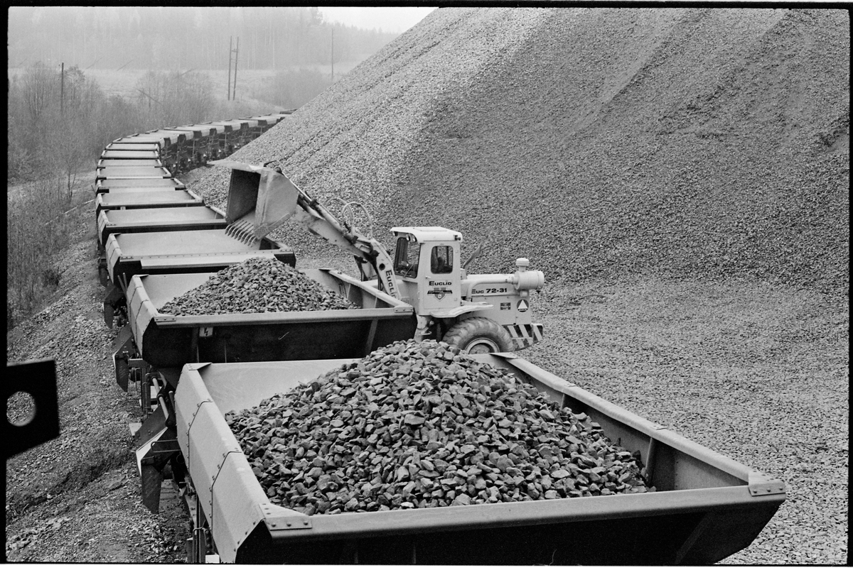 Bottentömningsvagnar, Statens Järnvägar, SJ Q 32. Lastning av makadam i Hjältakrossen.