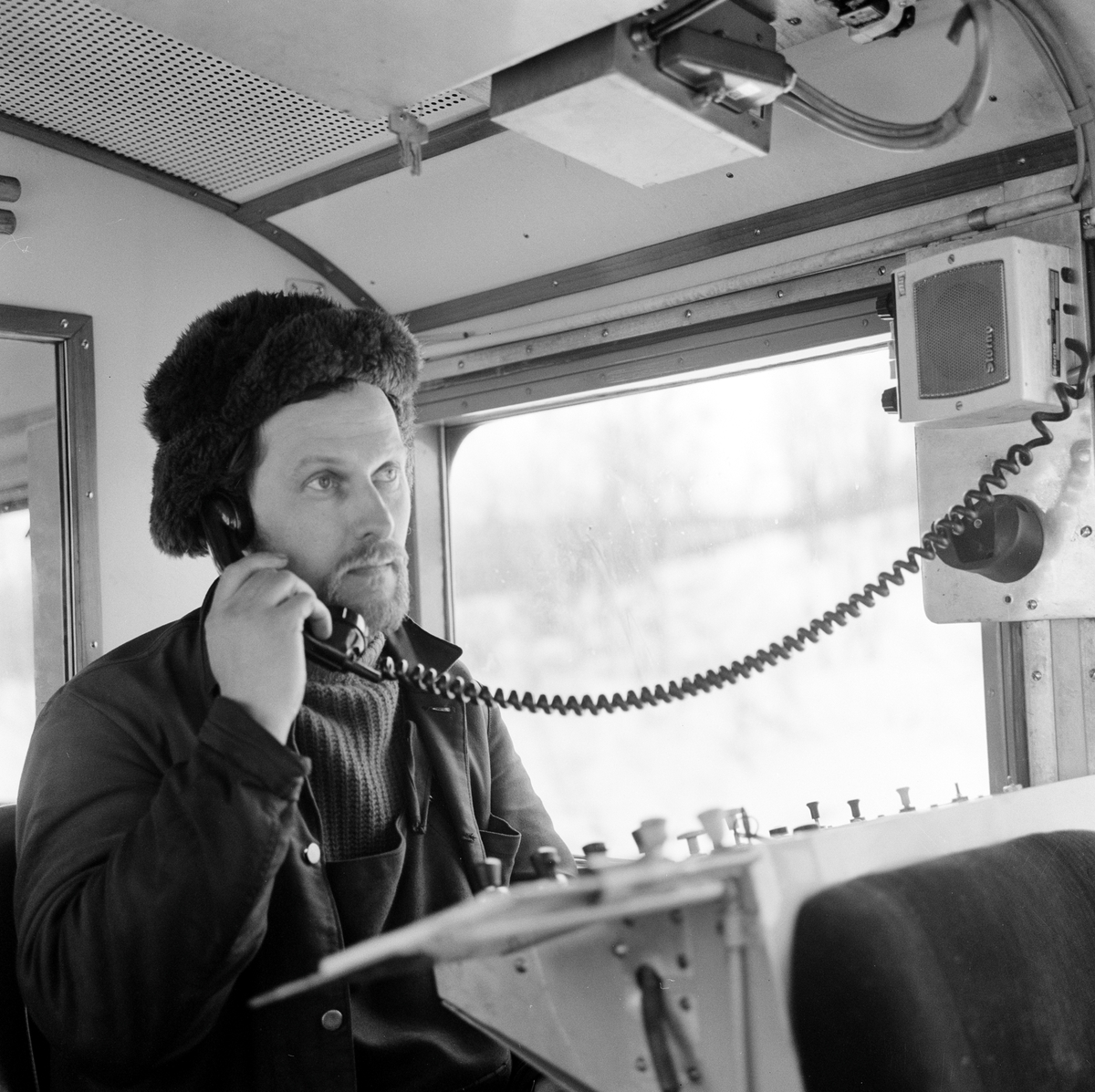 Abisko ambulansdressin, reparatör Ove Bengtsson talar i radio-telefon med fjärrblockeringen i Kiruna.