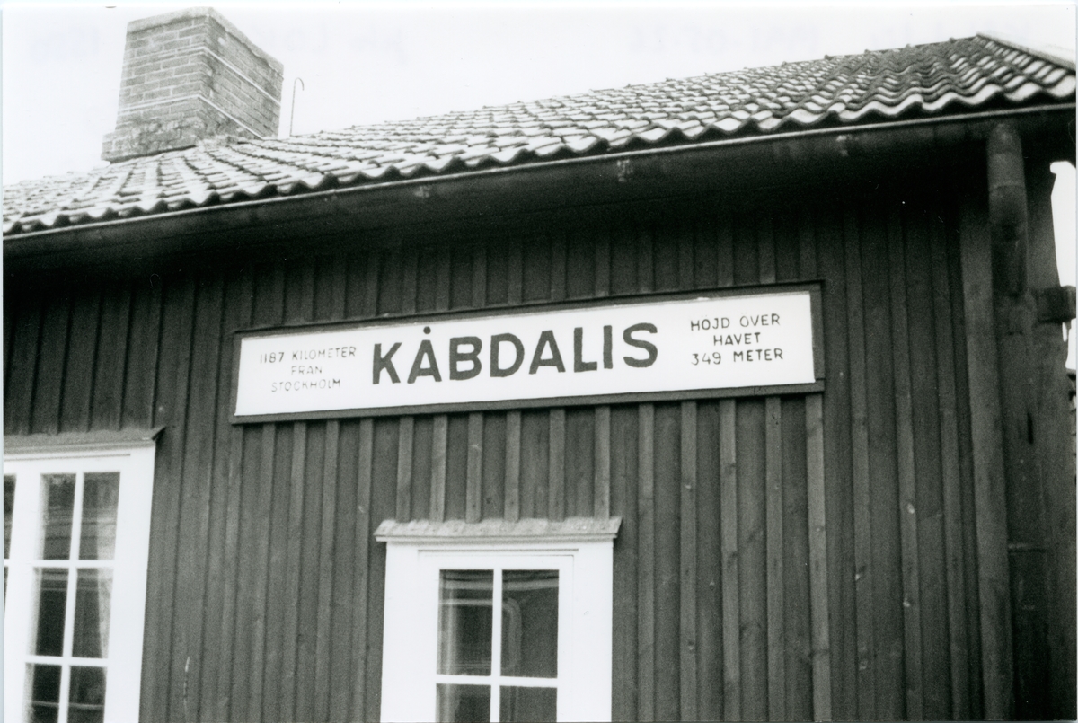 Kåbdalis järnvägsstation. Skylten på stationshuset.