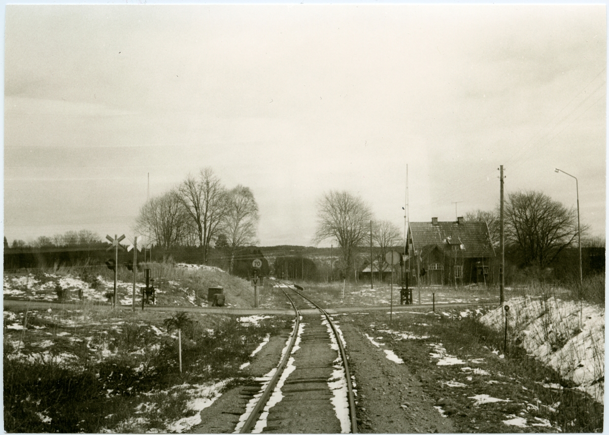 Spår och väg i plankorsning. Redvägsbrunn stationshus.