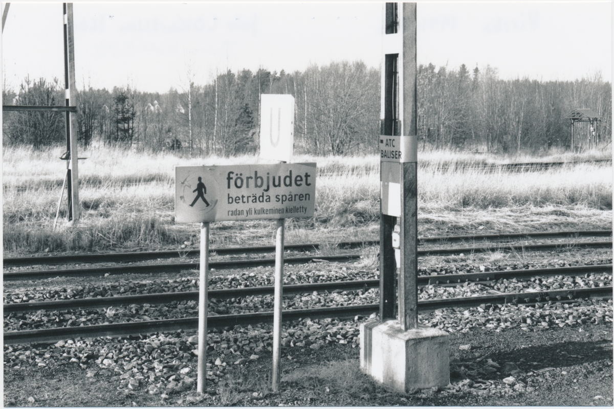 Skylt med varning om "förbjudet beträda spåren", vid Virsbo bangården.