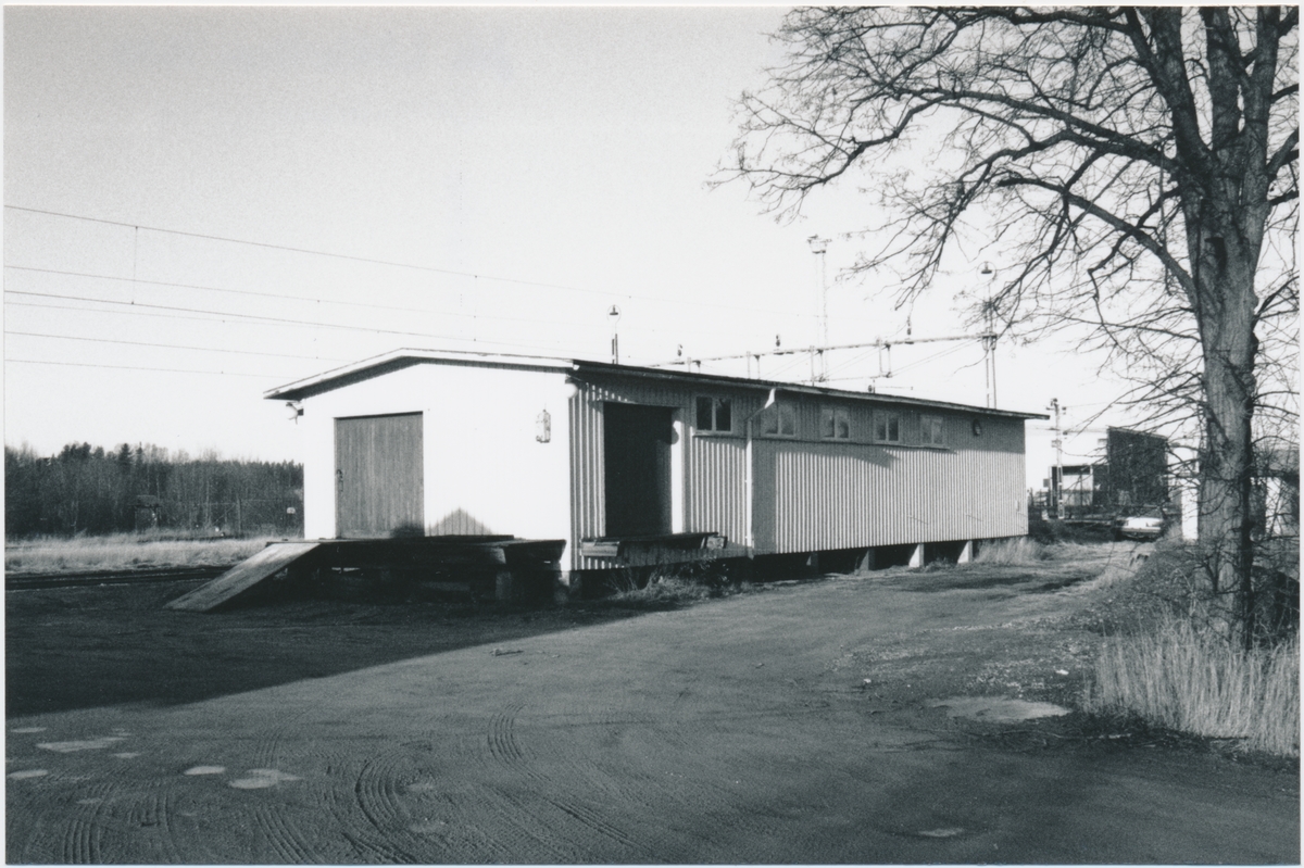 Del av bangården vid Virsbo station. Godsmagasinet från gatusidan.