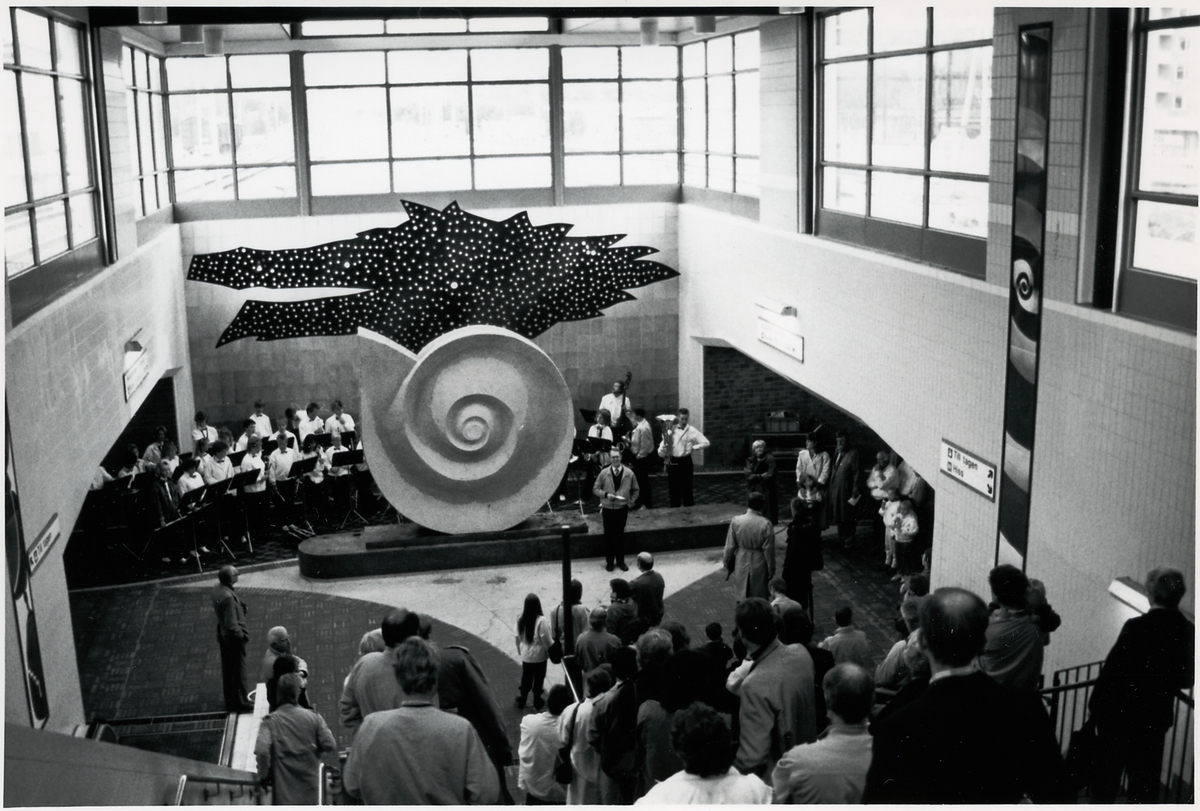 Titel: Invigning av Nils G. Stenqvists konstverk "Snäckfossil" 1986, Huddinge station.