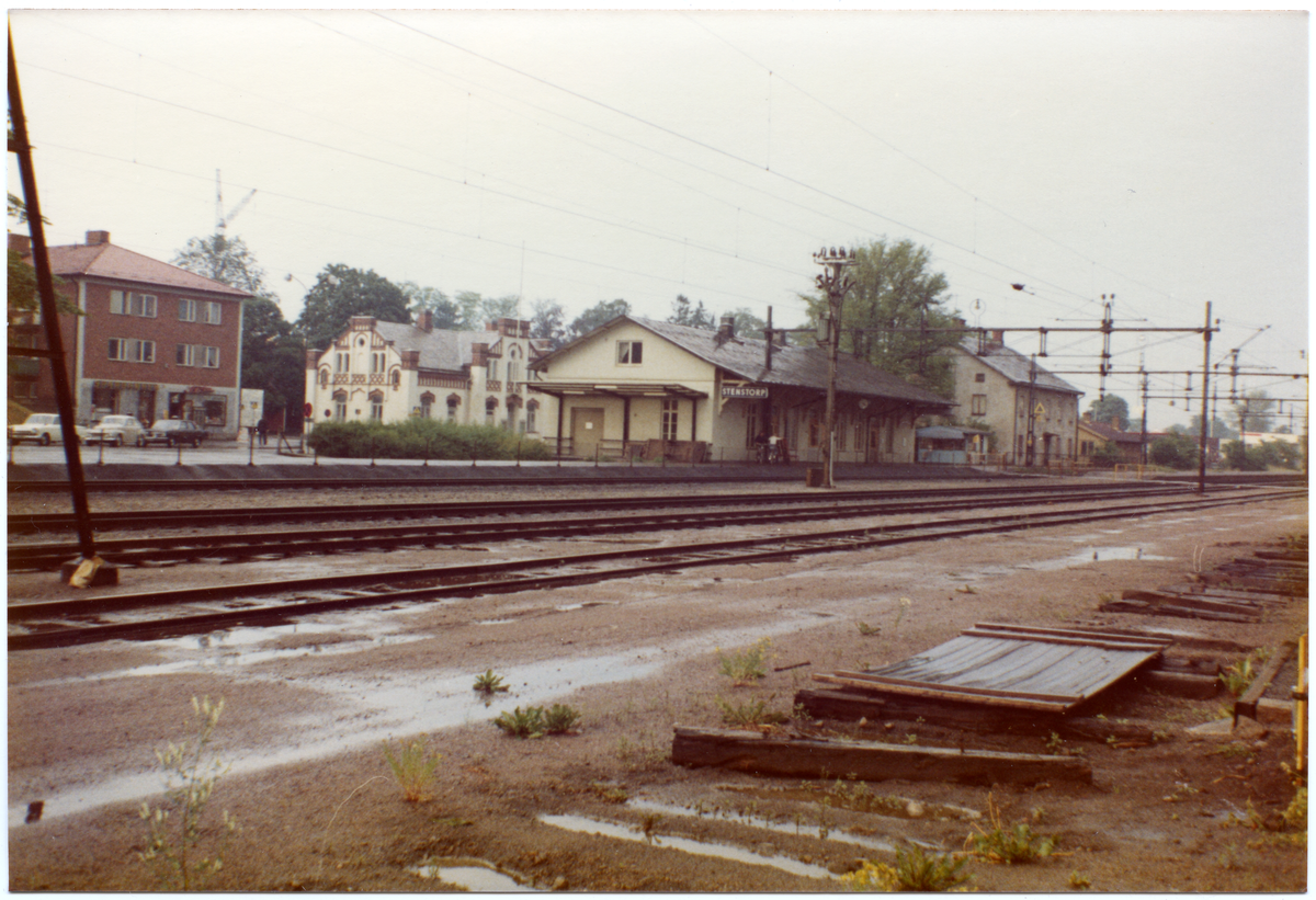 Titel: Stenstorps lilla stationshus flyttades 1873 och ändrades till betjäningshus på platsen. I stället byggdes ett nytt större envånings stationshus av sten, som sedemera tillbyggts .Stationen öppnades för trafik den 1/9 1859. Det första stationshuset byggdes 1858. Ny station, som ännu användes, uppfördes 1873 i samband med att HSJ öppnade för trafik. Gamla stationshuset revs 1995-04-25 för att ge plats åt de nya plattformarna. HSJ , Hjo - Stentorps Järnväg