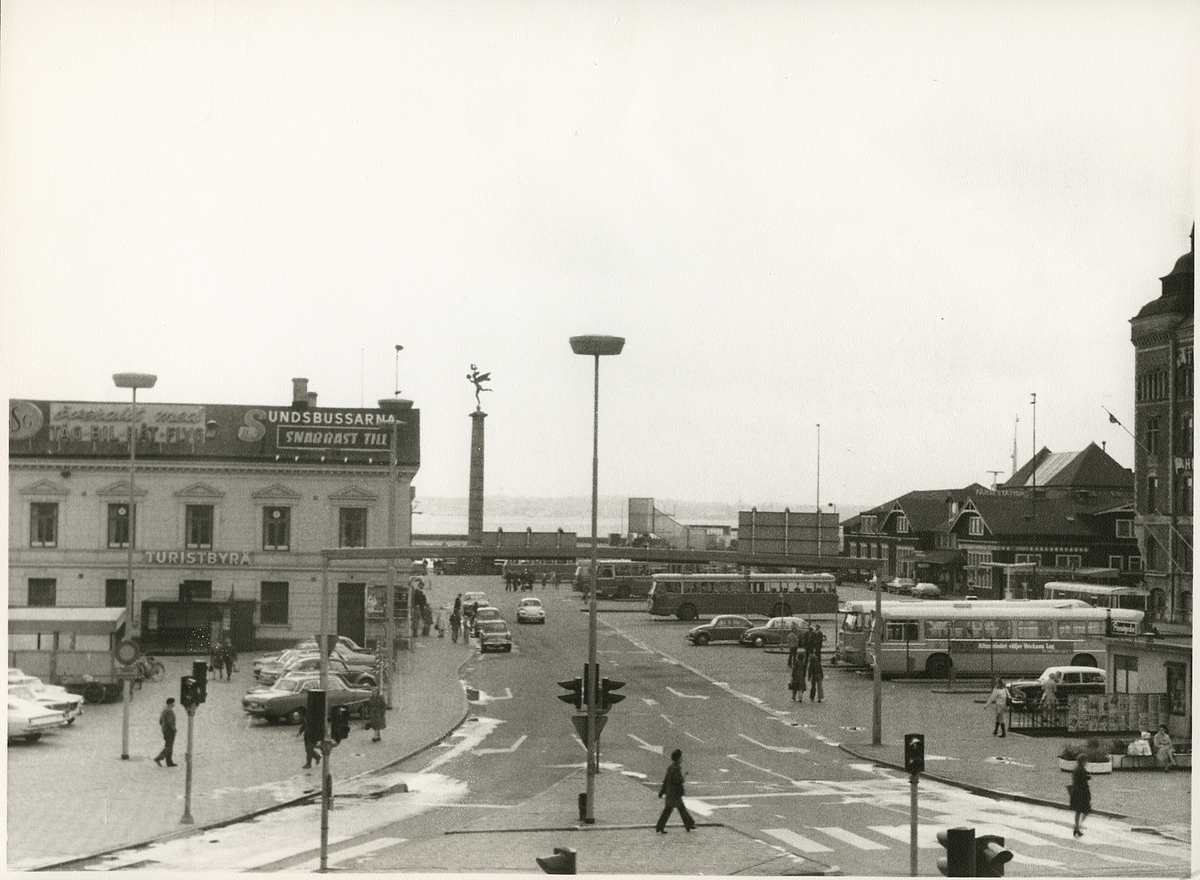 Helsingborg F (färjestation). Hamntorget med det 19 meter höga monumentet Sjöfartsgudinnan. Till höger stationshuset.