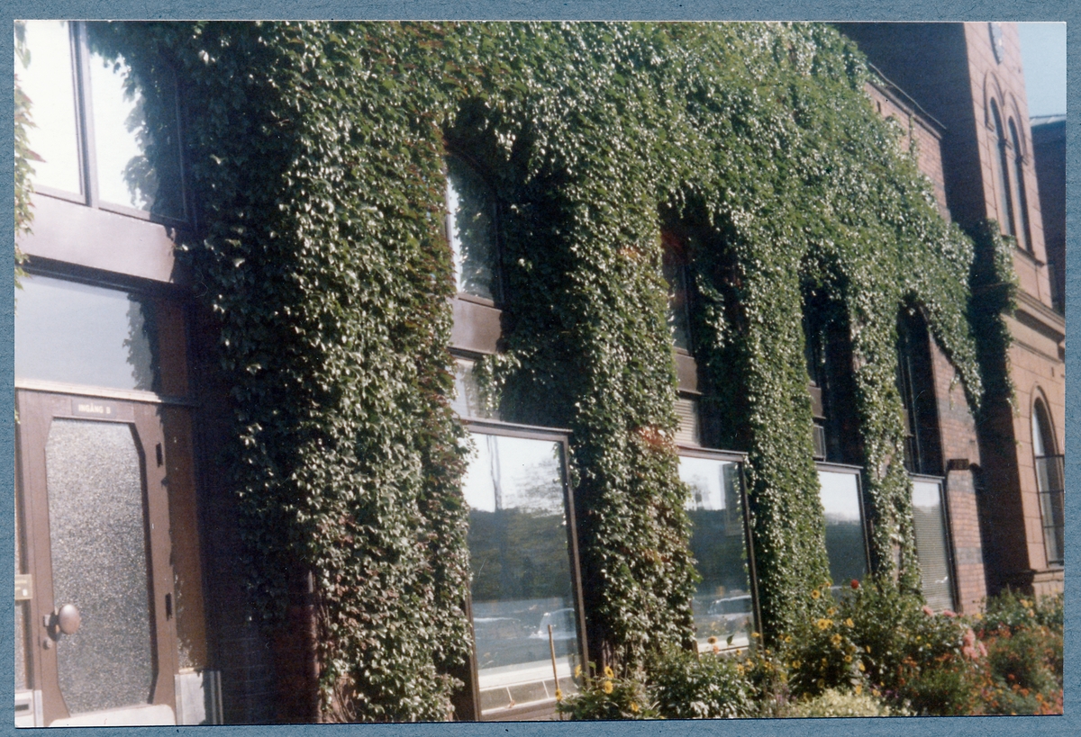 Del av stationsbyggnaden på Malmö central. Fasaden är täckt av murgröna.