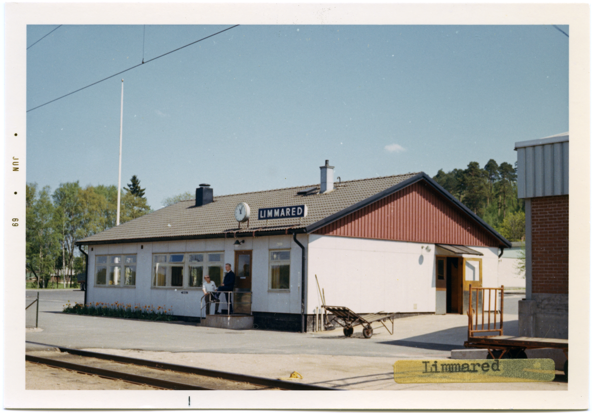 Vy vid Limmared. Stationshuset toligen byggt mellan 1964-1966 efter SJ Arkitekskontors Stockholms ritningar.