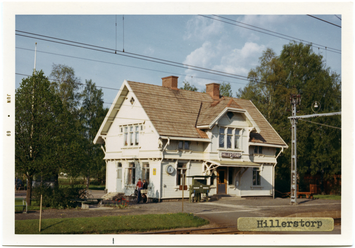Vy vid Hillerstorp.Stationshus byggt 1902. enligt ritningar av arkitekt TJ Folcke, Göteborg, Tvåvånings stationshus i trä. Mekanisk växelförregling
