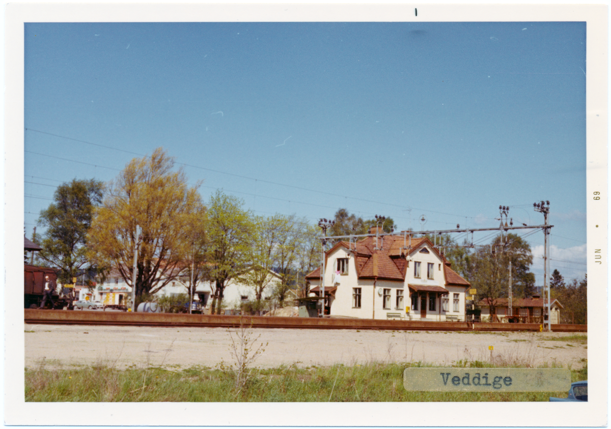 Vy vid Veddige. Station anlagd 1880. Tvåvånings stationshus, putsat byggt 1920 enligt arkiterk Harald Söderberg, Varberg. Elektrisk växelförregling.