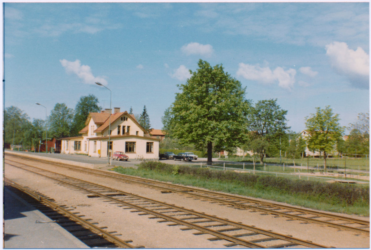 Titel: Station anlagd 1910. En och en halvvånings putsat stationshus. 1941 - 42 tillbyggdes två flyglar. VGJ , Västergötland - Göteborgs Järnväg