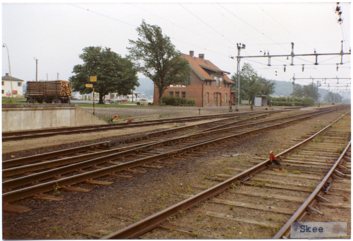 Station anlagd 1903. Stationshus i en och en halv våning i sten. En lastbilssläp med timmer och volvo amazon vid stationen.
