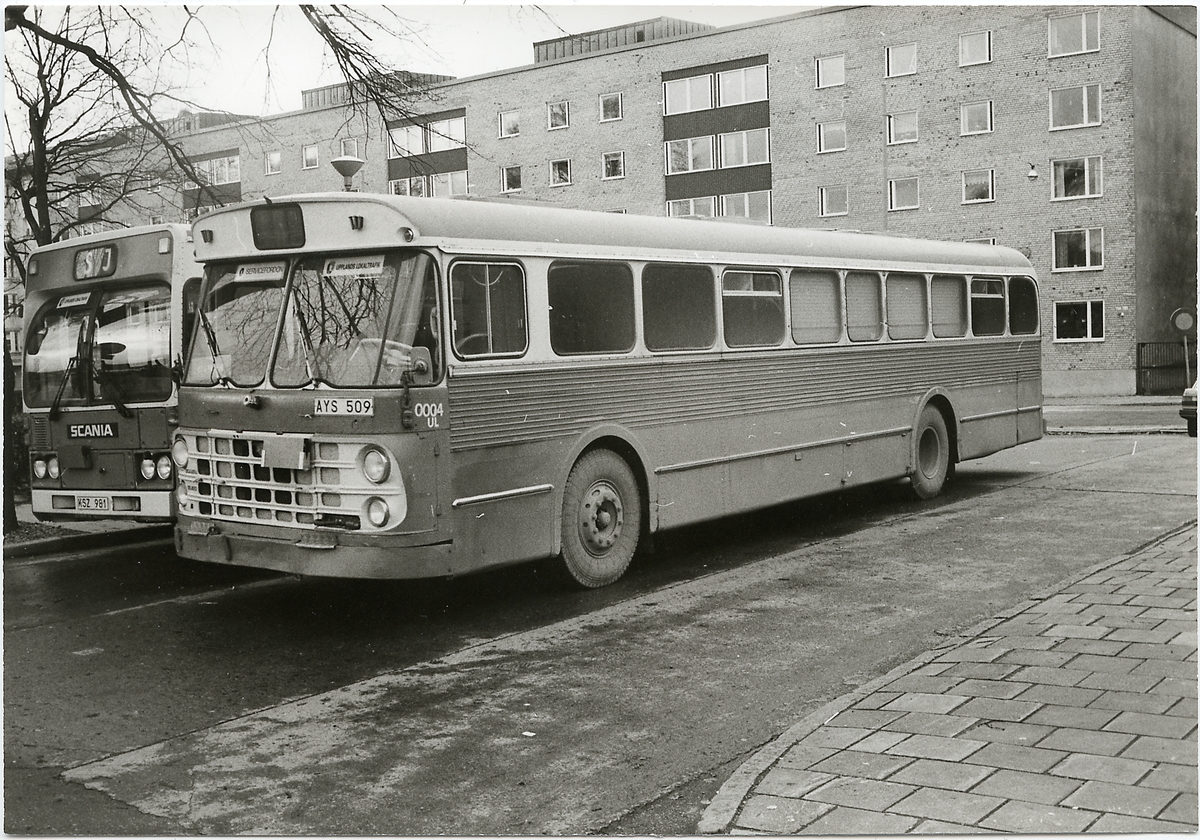Upplands Lokaltrafik, UL buss nummer 0004 bredvid en Statens Järnvägar, SJ buss av märket Scania parkerade i Uppsala.