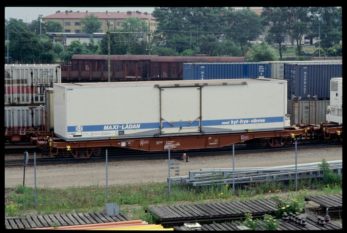 Statens Järnvägar SJ Sgjnqss-w 82-74-4581001-9. Öppen flakvagn lastad med container märkt SJ Maxi-lådan (Container utan gaveldörrar).