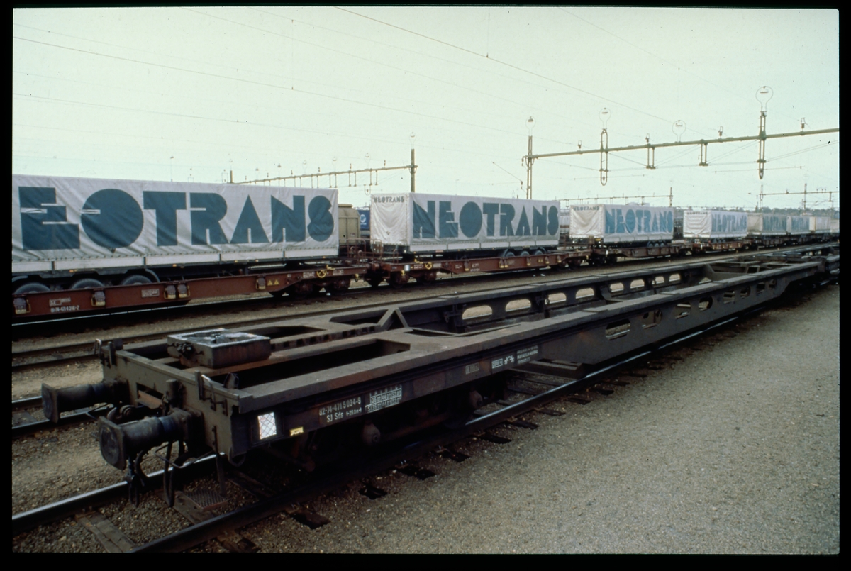 Flertalet SJ Sds bl.a. SJ Sds 82-74-4715034-9 och SJ Sds 82-74-4714316-1. Last bestående av lastbilssläp märkta Neotrans.