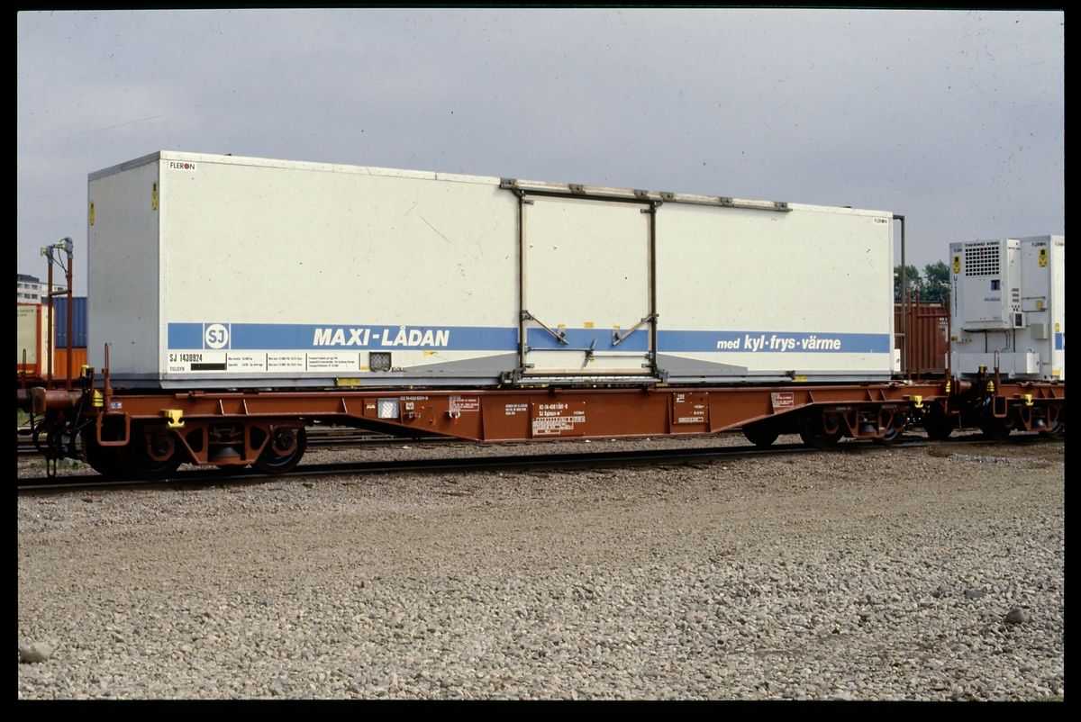 Statens Järnvägar, SJ Sgjnqss-w 82-74-4581001-9 lastad med SJ maxi-låda.