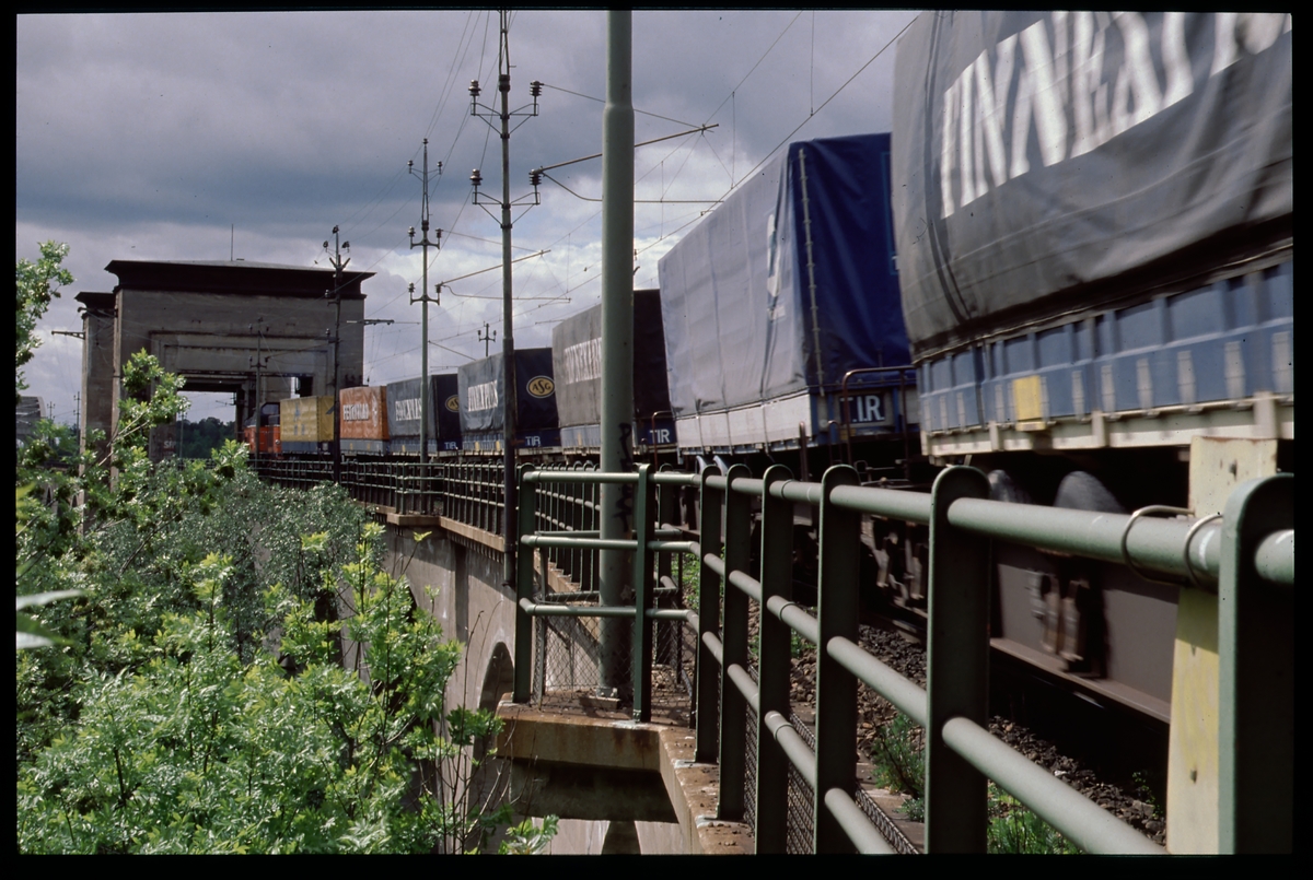 Statens Järnvägar, SJ Z 65 med lastade Sdins över Årstabron.