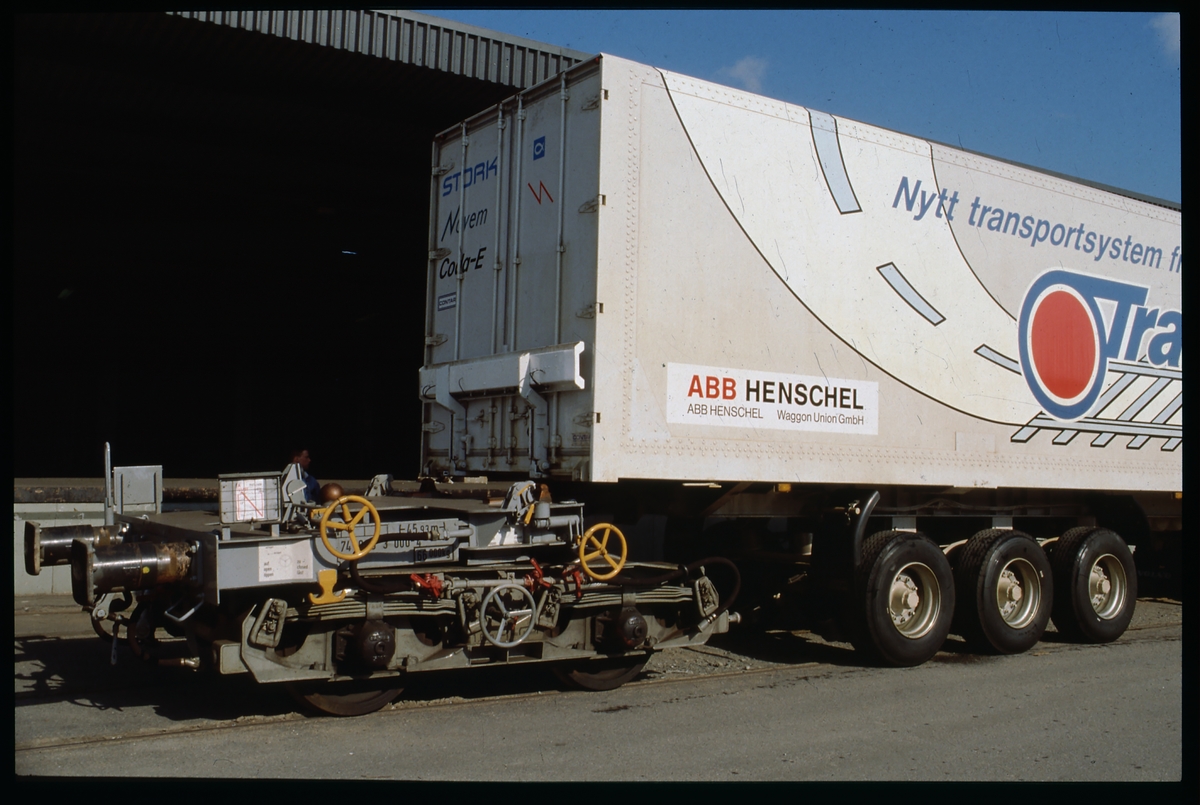 Lastbilssläp med SJ UAS mellanboggi till SJ Trailer-tåg.